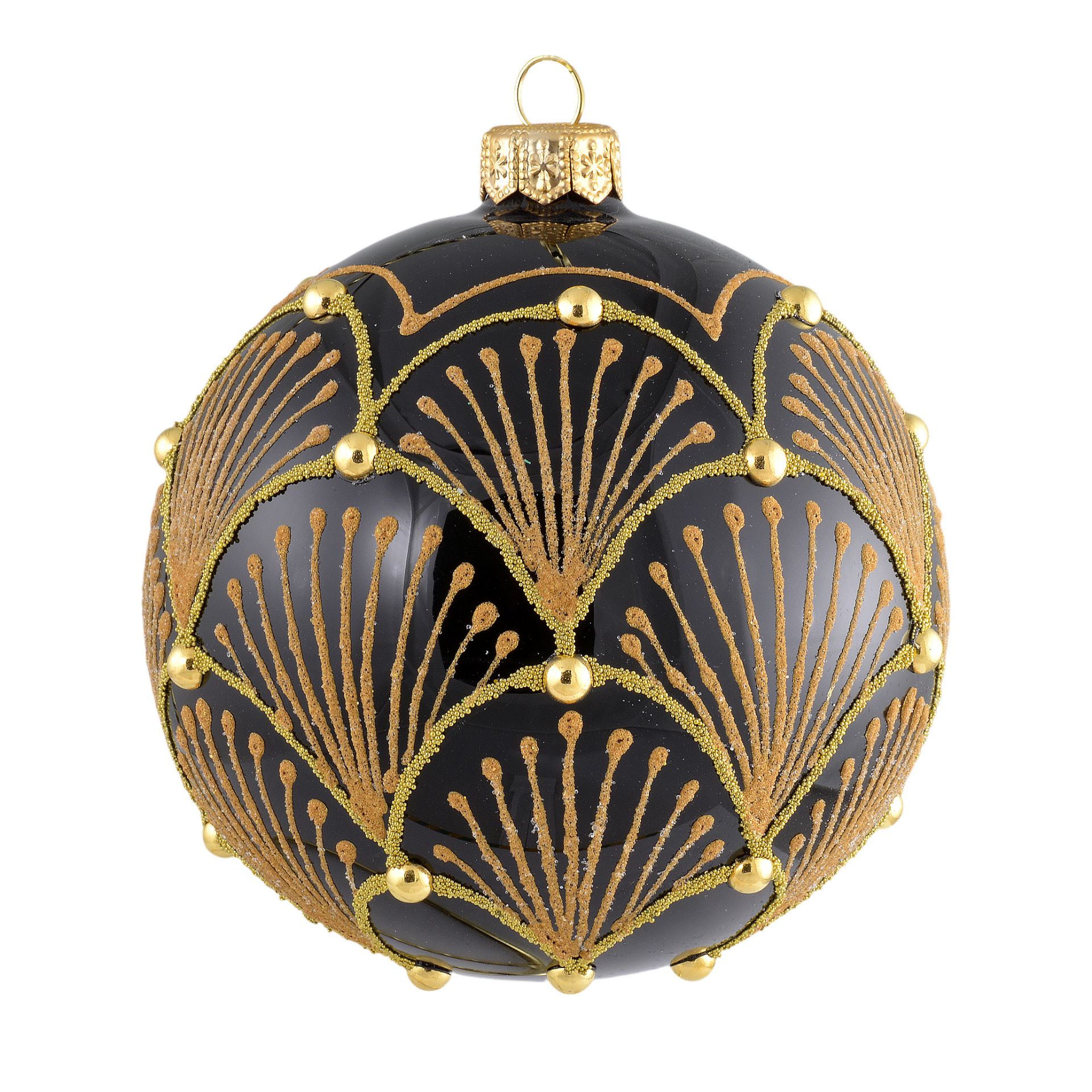 This 100mm black and gold glass ornament is a striking example of fine European craftsmanship. Each piece is individually hand blown and hand painted, resulting in subtle variations that make every ornament unique. The rich black background paired with shimmering gold accents creates a sophisticated, timeless look that adds elegance to any Christmas tree or holiday décor. The ornament arrives beautifully packaged in a gift box, making it an ideal luxurious gift for the holidays, weddings, or special occasions. Proudly made in Ukraine using traditional artisan techniques and shipped from the United States for fast, reliable delivery.