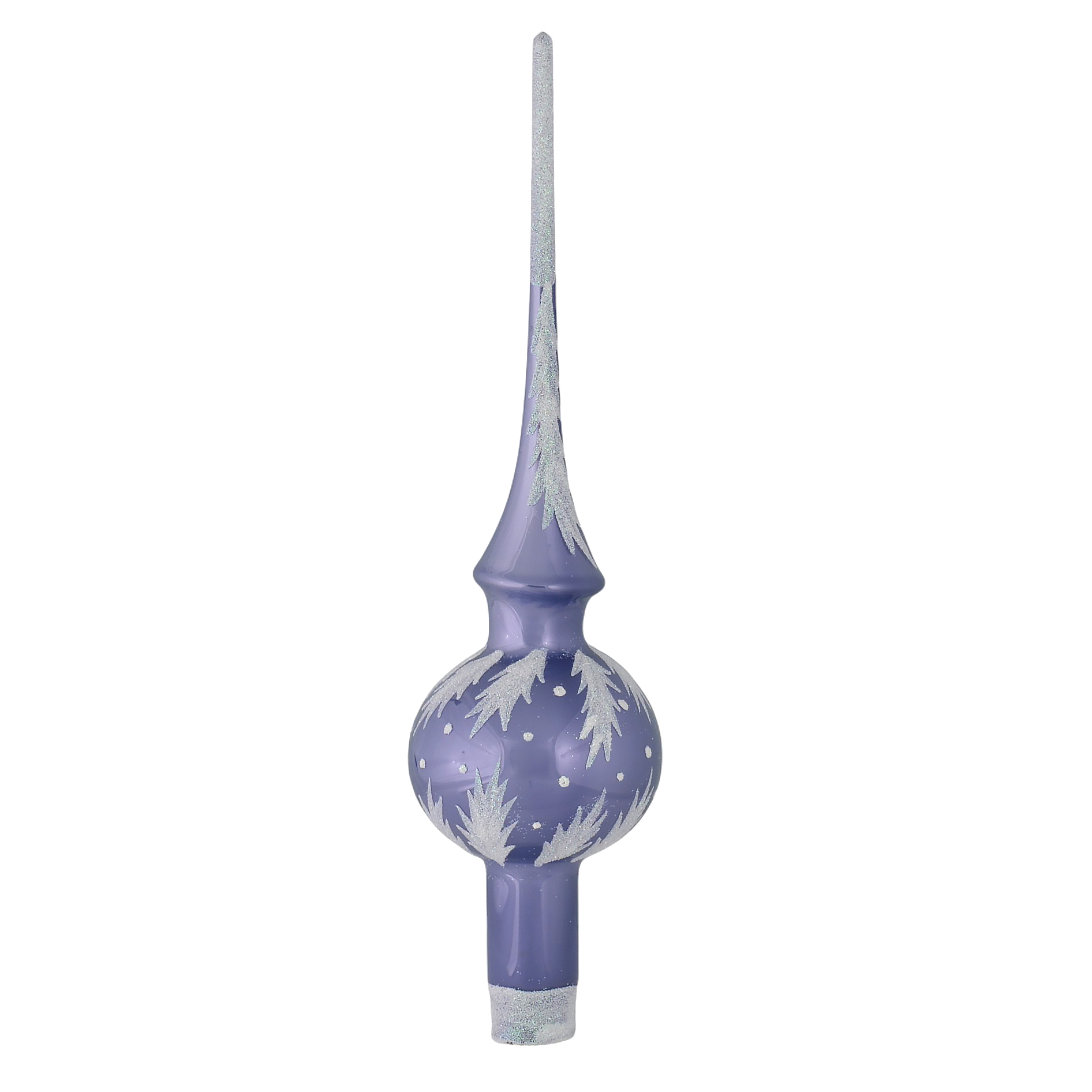 "Crystal" blue Christmas tree finial stands 11" (279 mm) high to adorn the top of your tree in a beautiful blue finish. It is highlighted by iridescent colored glitter resembling a leafy pattern design wrapped around the ball portion of the finial. The spire above sparkles with the same frosty glitter with the addition of two long sparkling leaves curling below. Small white dots were carefully placed to give the appearance of falling snow. Surely a tree topper to enhance the beauty of your Christmas tree or simply to display on a finial stand in your home as an accent piece. Each glass finial is painted individually which makes them unique and adds some small variations to each product in height and bottom opening. Made in Ukraine.
